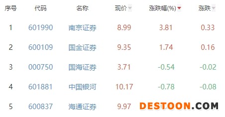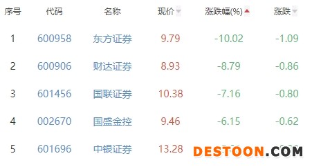 东方证券、财达证券、国联证券、国盛金控、中银证券位列涨幅榜后五位,涨幅分别为-10.02%、-8.79%、-7.16%、-6.15%、-5.68%。