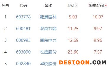 其中,乾景园林、双良节能、闽东电力、宏盛股份、华统股份位列板块涨幅前五位,涨幅分别为10.07%、9.97%、9.96%、7.57%、7.36%。