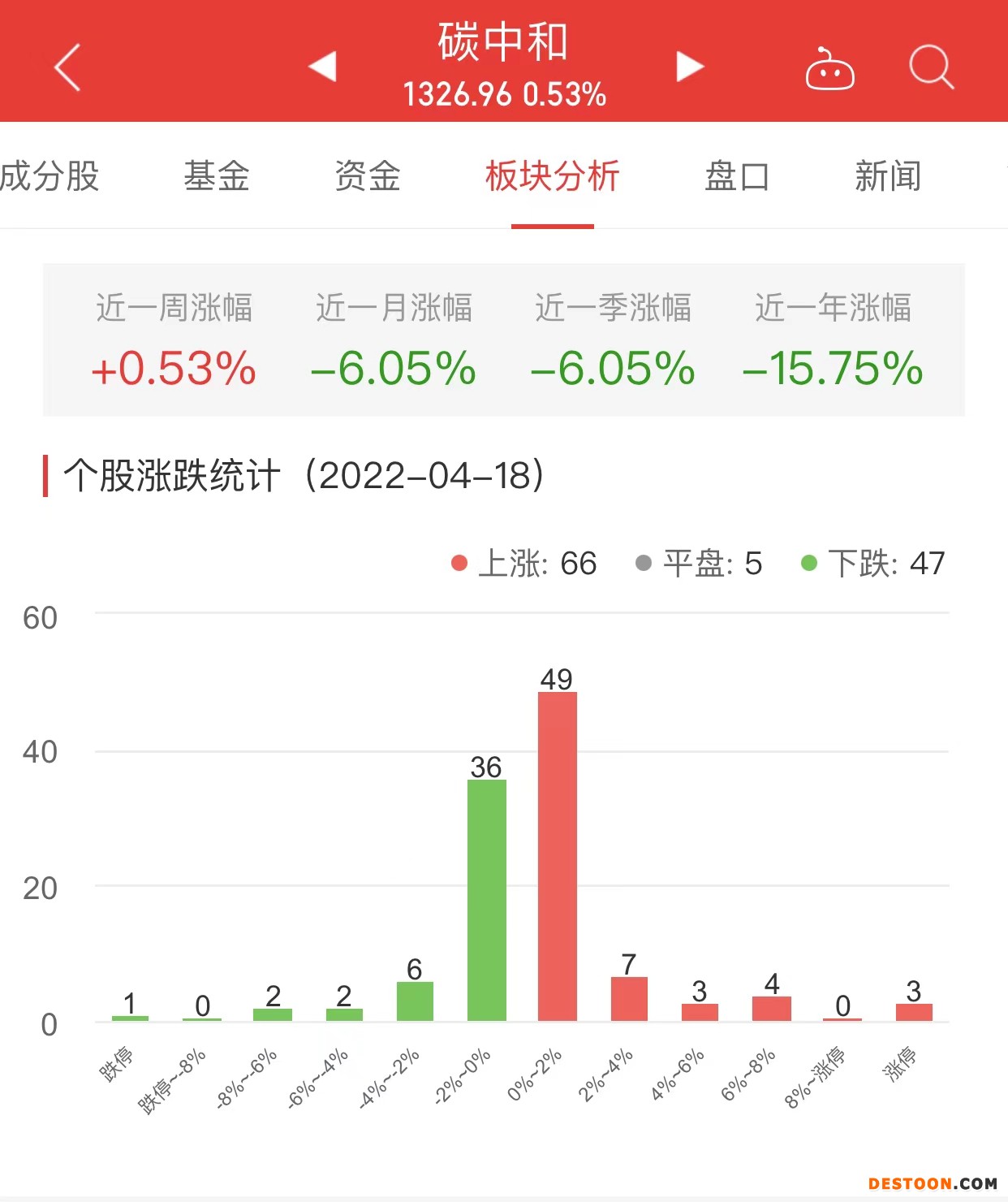 中国经济网北京4月18日讯 今日,碳中和板块整体涨幅0.53%,其中66只股票上涨,5只股票平盘,47只股票下跌。