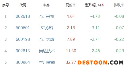 *ST丹邦、ST方科、*ST大唐、崇达技术、本川智能位列涨幅榜后五位,涨幅分别为-4.73%、-3.11%、-2.71%、-2.46%、-2.18%。