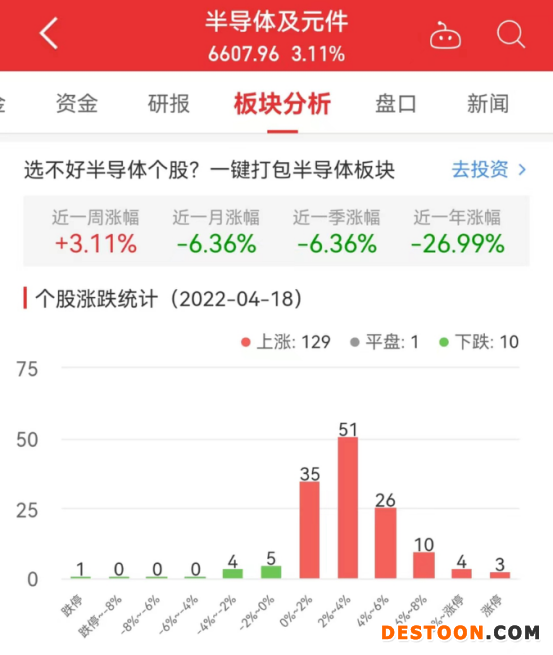 中国经济网北京4月18日讯 今日,半导体及元件板块整体涨幅3.11%,其中129只股票上涨,1只股票平盘,10只股票下跌。