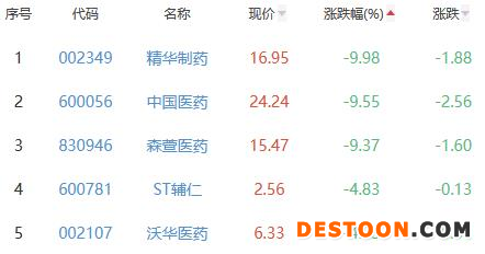 精华制药、中国医药、森萱医药、ST辅仁、沃华医药位列涨幅榜后五位,涨幅分别为-9.98%、-9.55%、-9.37%、-4.83%、-4.53%。