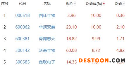其中,四环生物、华润双鹤、青海春天、沃森生物、奥联电子位列板块涨幅前五位,涨幅分别为10.00%、10.00%、9.99%、8.72%、7.81%。