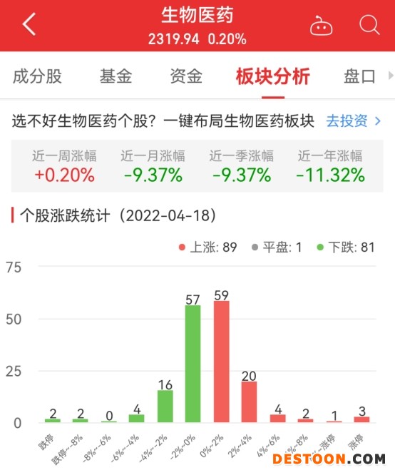 中国经济网北京4月18日讯 今日,生物医药板块整体涨幅0.20%,其中89只股票上涨,1只股票平盘,81只股票下跌。