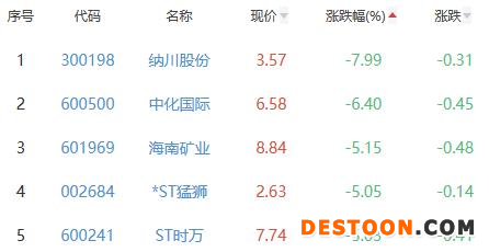纳川股份、中化国际、海南矿业、*ST猛狮、ST时万位列涨幅榜后五位,涨幅分别为-7.99%、-6.40%、-5.15%、-5.05%、-5.03%。