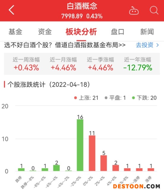 中国经济网北京4月18日讯 今日,白酒概念板块整体涨幅0.43%,其中21只股票上涨,1只股票平盘,20只股票下跌。