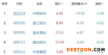 中锐股份、盘江股份、皇台酒业、建发股份、中恒集团位列涨幅榜后五位,涨幅分别为-10.02%、-6.58%、-4.81%、-4.60%、-1.91%。