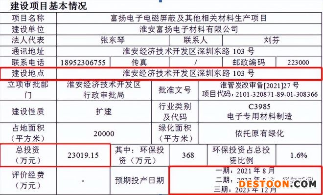 另外,据“富扬电子电磁屏蔽及其他相关材料生产项目”环境影响报告表显示,该项目建设性质属于扩建,改扩建项目位于淮安经济技术开发区深圳东路103号,在现有厂区内扩建。该项目预期投产日期一期是2021年8月,二期2022年8月,三期2023年12月,建设期大于24个月。