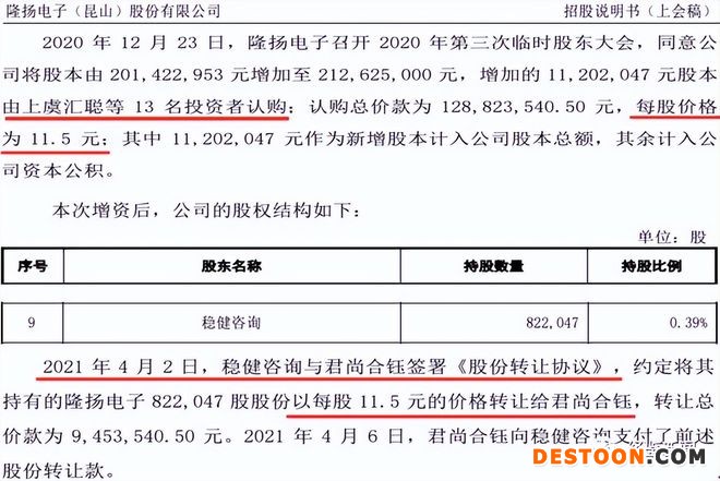 2020年12月23日,隆扬电子召开股东临时大会,同意将股本由增加到212,625,000元,增加的11,202,047元股本由上虞汇聪等13名投资者认购,认购总价款为128,823,540.50元,每股价格为11.5元;12月29日工商变更后,稳健咨询成为隆扬电子股东之一。