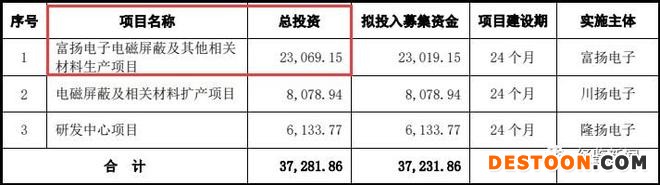 据披露,募集资金投资项目之一“富扬电子电磁屏蔽及其他相关材料生产项目”拟投资23,069.15万元,由全资子公司富扬电子负责实施。