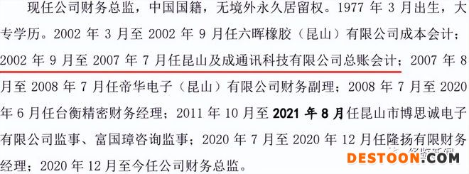 招股说明书披露,王彩霞女士为隆扬电子财务总监,其曾于2002年9月-2007年7月效力于昆山及成通讯科技有限公司。