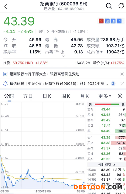 18日盘中,招商银行股价大跌,盘中一度跌超8%,股价最低触及42.78元/股。罕见的大跌使得该股一度冲上微博热搜,引发不小热议。
