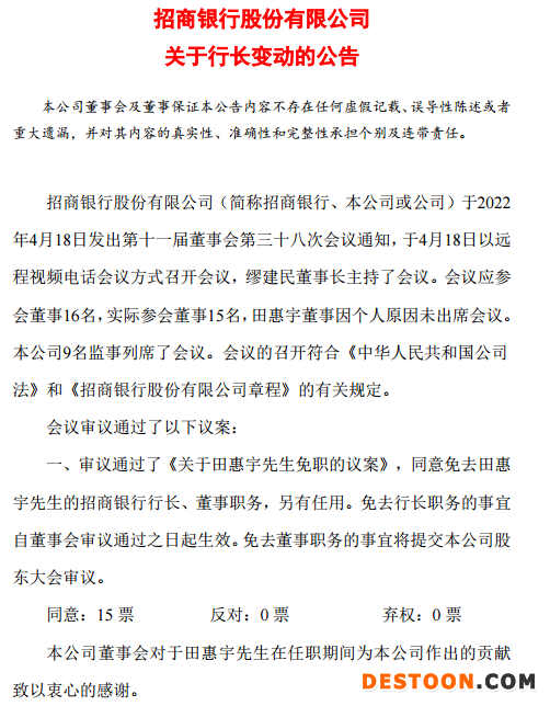 招商银行重大人事变动:免去田惠宇行长职务!已任行长9年,今天未出席董事会,公司股价罕见跌超7% 2022-04-18 18:43 来源:每日经济新闻