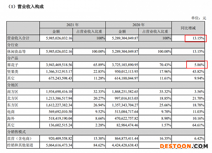 其中,按产品分类,葵花子实现收入39.43亿元,同比增长5.86%;坚果类实现收入13.66亿元,同比增长43.82%;其它实现收入6.75亿元,同比增长9.94%。