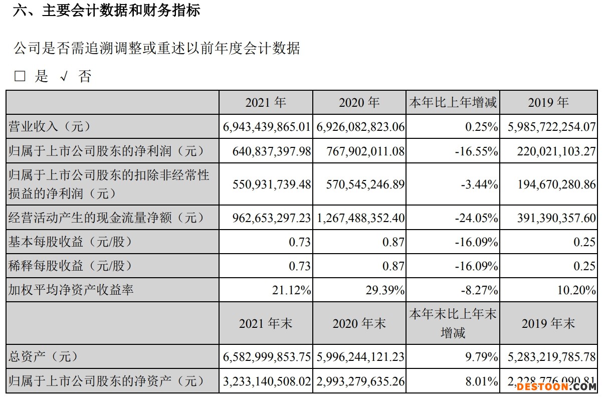 此外,经营活动产生的现金流量净额为9.63亿元,同比回落24.05%;基本每股收益0.73元/股,同比回落16.09%。