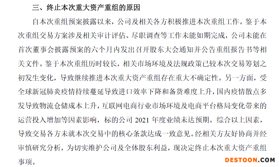 另一方面,上市公司称,受全球新冠肺炎疫情持续蔓延导致进口效率下降和备货难度上升,国内疫情散点多发导致物流仓储成本上升,互联网电商行业市场环境及电商平台格局变化带来的运营投入增加等因素影响,标的公司2021年度业绩未达预期。