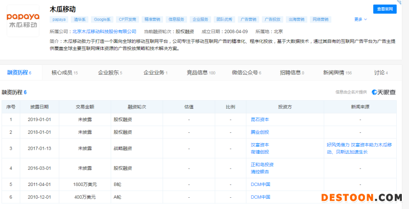 天眼查信息显示,截至目前,木瓜移动已完成6轮融资。投资方包括DCM中国、昆石资本等公司与机构,最近一轮融资发生于2019年1月,据今已三年有余。