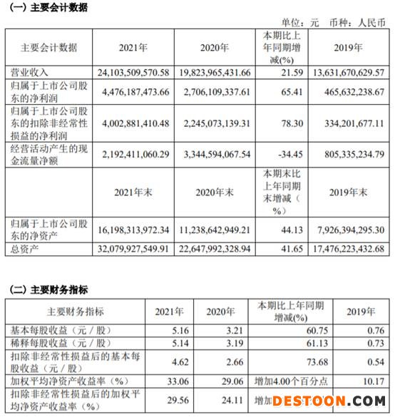 中国经济网北京4月19日讯 昨日晚间,韦尔股份(603501.SH)披露了2021年年度报告。2021年,公司实现营业收入241.04亿元,同比增长21.59%;归属于上市公司股东的净利润为44.76亿元,同比增长65.41%;归属于上市公司股东的扣非净利为40.03亿元,同比增长78.30%;经营活动产生的现金流量净额为21.92亿元,同比下降34.45%。