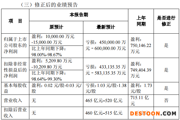 除了华联股份,同日,荣盛发展也对业绩进行了修正。荣盛发展公告,预计2021年度净亏损45亿元-60亿元,此前预计盈利1亿元-1.5亿元。公司出于谨慎性考虑,在与会计师事务所充分沟通后,重新评估预期销售价格情况及对存货的影响,对2021年末公司存货补充计提了存货跌价准备。
