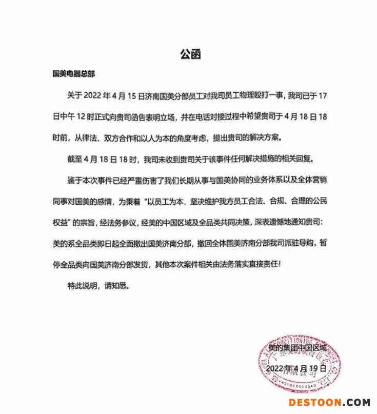 公函称,鉴于本次事件已经严重伤害了美的中国区域长期从事与国美协同的业务体系以及全体营销同事对国美的感情,为秉着“以员工为本,坚决维护我方员工合法、合规、合理的公民权益”的宗旨,经法务参议,经美的中国区域及全品类共同决策: