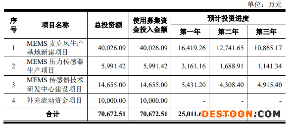 敏芯股份最终募集资金净额较原计划多2559.58万元。敏芯股份2020年8月4日发布的招股说明书显示,公司计划募集资金7.07亿元,分别用于MEMS麦克风生产基地新建项目、MEMS压力传感器生产项目、MEMS传感器技术研发中心建设项目、补充流动资金项目。