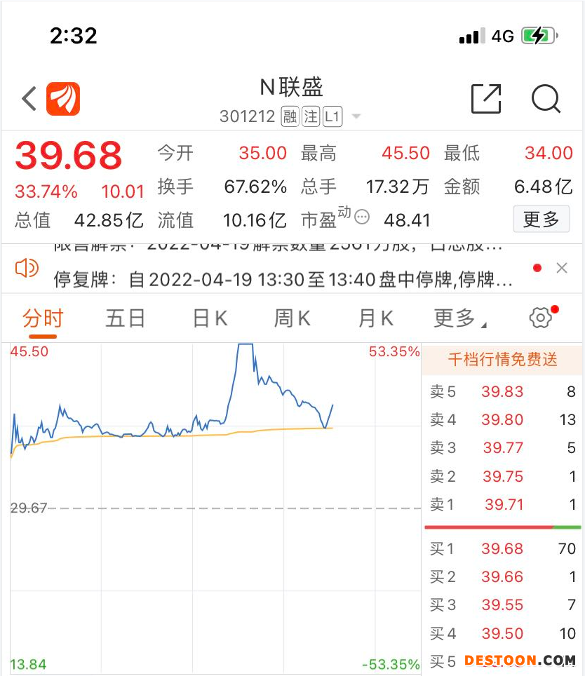 创业板新股联盛化学今日上市,开盘价35.00元,上涨17.96%,午后开盘一度涨超53%,较开盘价涨幅达30%,触发临停。截至发稿,该股大涨29.93%,报38.59元,最新市值为41.99亿元。