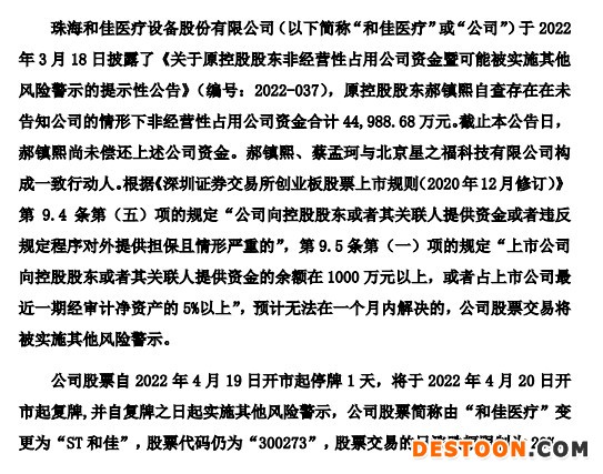 原控股股东占用资金4.5亿!和佳医疗将被ST