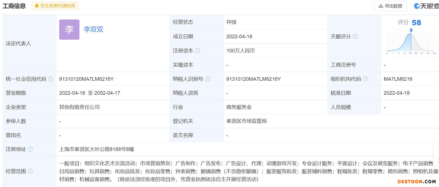 天眼查APP显示,泡泡玛特于4月18日新成立上海零作文化创意有限公司(下称“上海零作文创”),注册资金100万元,法定代表人为李双双,注册地址为上海市奉贤区大叶公路8188号8幢。公司由北京泡泡玛特商贸有限公司100%持股。