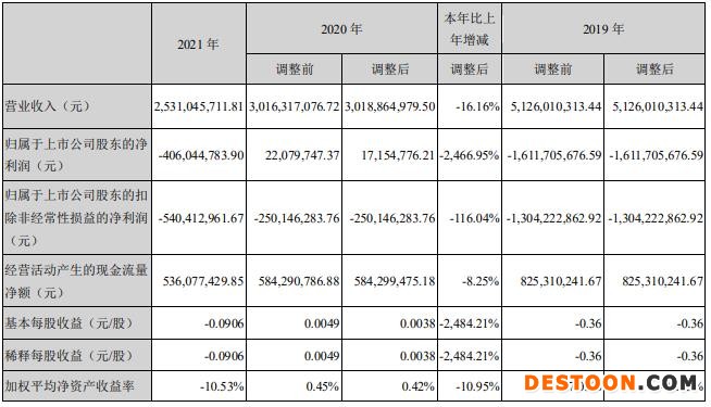 爱康科技去年实现营业收入25.31亿元,同比下滑16.16%,且2019年和2020年营收分别为51.26亿元、30.19亿元;归属于上市公司股东的净利润为-4.06亿元,同比下滑2466.95%;归属于上市公司股东的扣除非经常性损益的净利润为-5.40元,同比下滑-116.04%;经营活动产生的现金流量净额为5.36亿元,同比下滑8.25%。