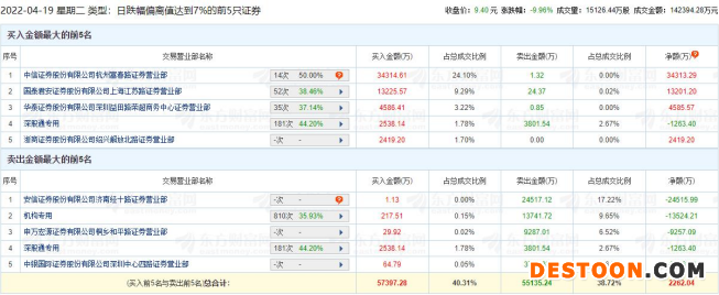 中国经济网北京4月19日讯 劲嘉股份(002191.SZ)今日跌停,截至收盘报9.40元,跌幅9.96%。龙虎榜数据显示,卖出劲嘉股份金额最大的