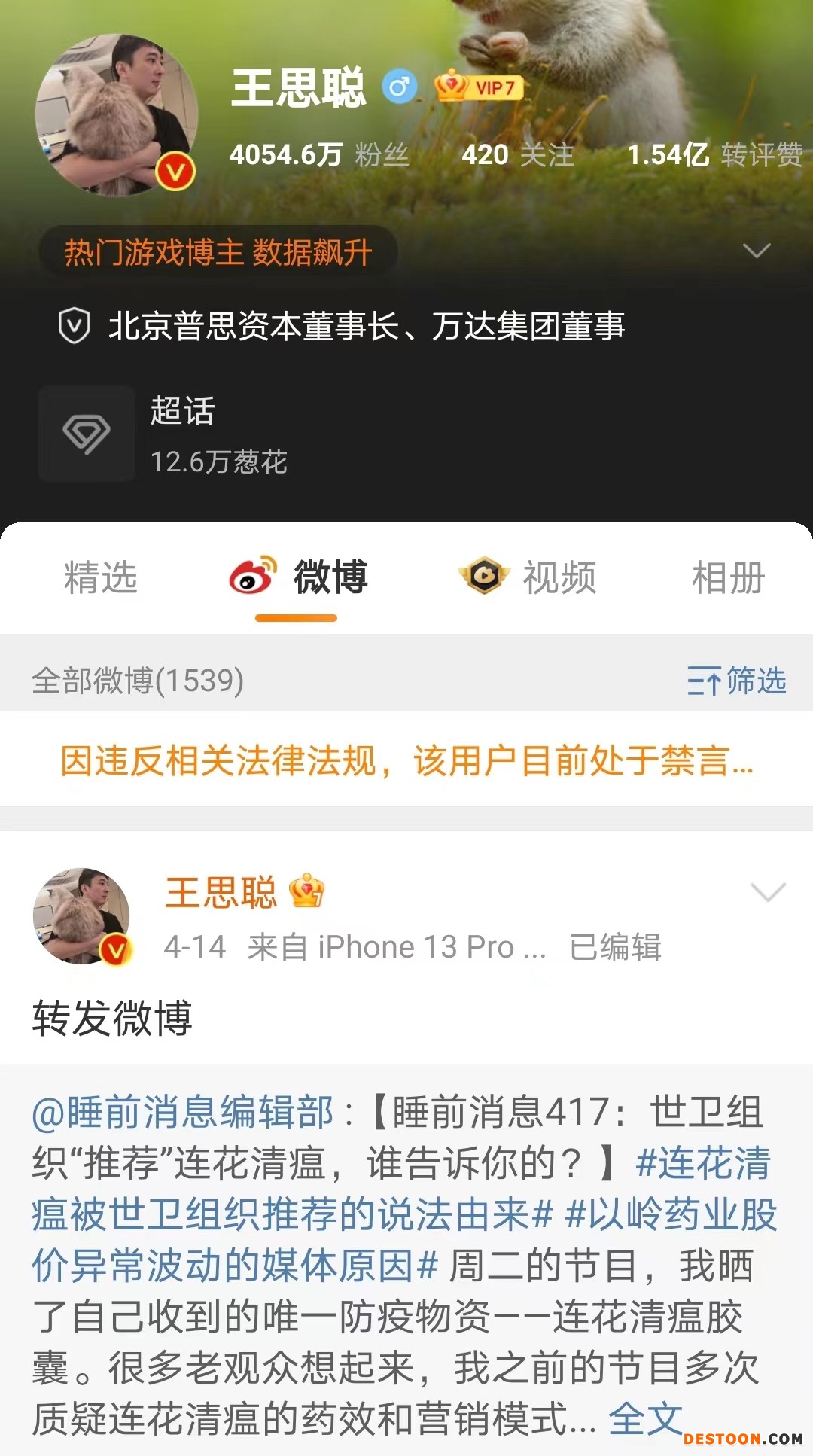 中新经纬4月19日电 19日下午,中新经纬发现,王思聪的新浪微博显示“因违反相关法律法规,该用户目前处于禁言状态”。