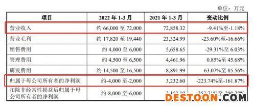 据经纬恒润2022年一季度业绩预告显示,公司预计报告期内实现营业收入为6.6亿元至7.2亿元,同比下降9.41%至1.18%,净利润为-4000万至-2000万,预计下降223.74%至161.87%。