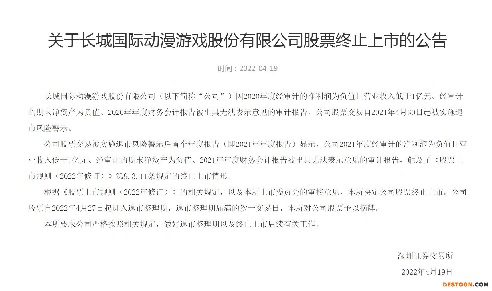 19日晚间,深交所公告称,决定长城国际动漫游戏股份有限公司(*ST长动,000835)股票终止上市,4月27日起进入退市整理期。