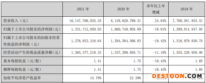 2021年,老板电器基本每股收益1.41元/股,同比减少19.43%;加权平均净资产收益率15.78%,比上年同期减少6.61个百分点。