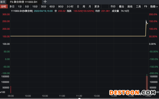 三分钟内,聚合转债的价格从150元的复牌价,最高拉升至300元,迅速翻了一番;随后涨幅有所收窄,但全天仍上涨133.52%,创出沪深两市有可转债发行纪录以来新券上市首日最大涨幅。