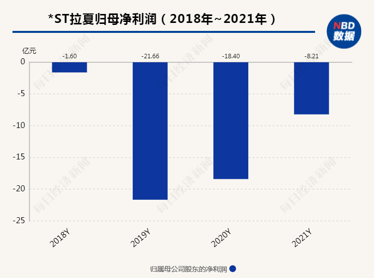 巅峰过后就是下坡路,同样是2018年,*ST拉夏开始陷入亏损困境。2018~2021年,*ST拉夏归属于上市公司股东的净利润分别为-1.60亿元、-21.66亿元、-18.40亿元和-8.21亿元,四年合计亏损约49.87亿元。