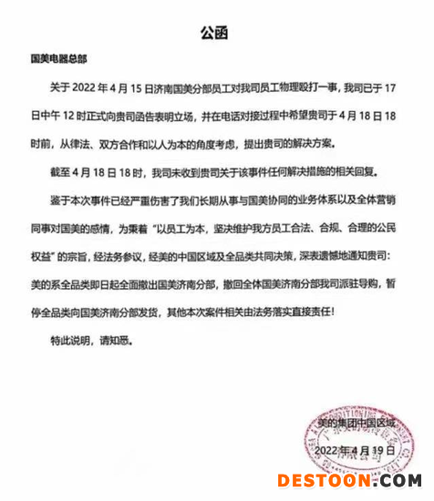 美的公函显示,该事件起因为2022年4月15日济南国美分部员工对美的员工物理殴打一事。美的中国区域已于17日中午12时正式向国美函告表明立场,并在电话对接过程中希望国美于4月18日18时前,从律法、双方合作和以人为本的角度考虑,提出国美的解决方案。