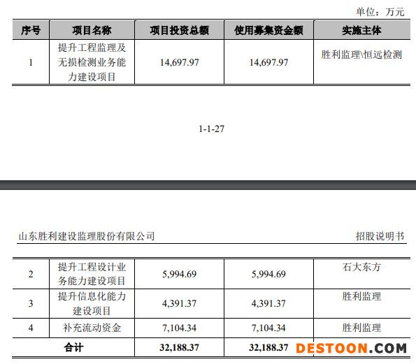 胜利监理原拟公开发行股票数量不超过9721.51万新股,且不低于发行后总股本的25.00%,本次发行原股东不公开发售股份。胜利监理原拟募集资金3.22亿元,计划分别用于提升工程监理及无损检测业务能力建设项目、提升工程设计业务能力建设项目、提升信息化能力建设项目、补充流动资金。