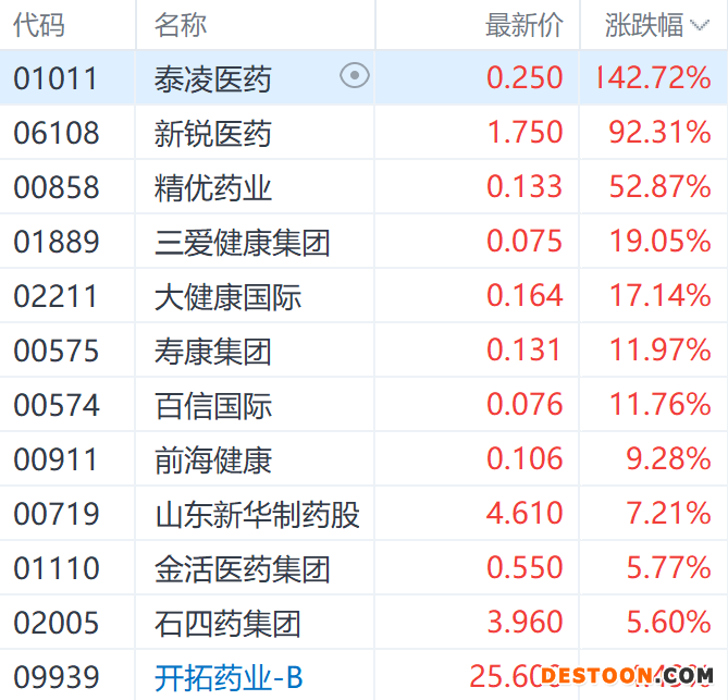 财联社4月20日电,港股医药板块早盘走强,截止发稿,新锐医药(06108.HK)、泰凌医药(01011.HK)和开拓药业(09939.HK)分别上涨93.31%、142.72%、4.49%。