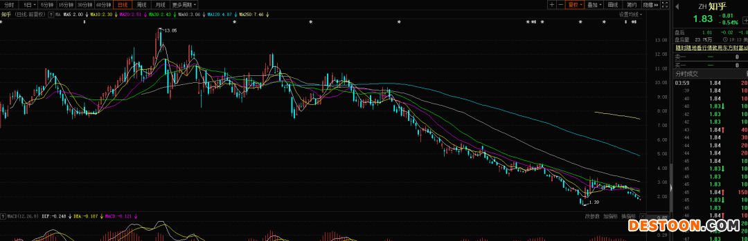 据了解,知乎于2021年3月26日在美股上市,发行价每份ADR为9.5美元,股价曾一度涨至13.85美元,然而好景不长,知乎股价一路下跌,截止目前,知乎报1.83美元/ADR,距前高点跌超80%。