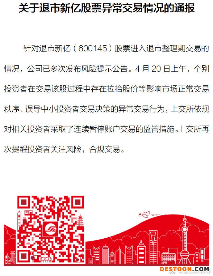 上交所称,针对退市新亿(600145)股票进入退市整理期交易的情况,公司已多次发布风险提示公告。4月20日上午,个别投资者在交易该股过程中存在拉抬股价等影响市场正常交易秩序、误导中小投资者交易决策的异常交易行为。