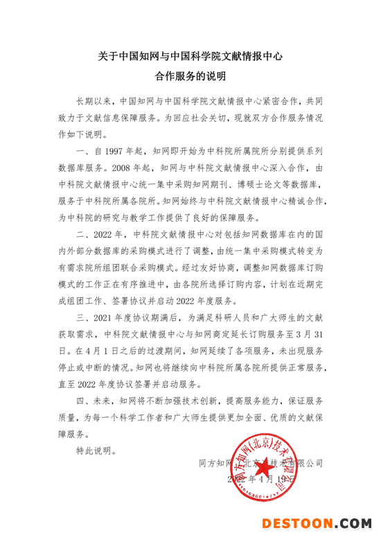 三、2021年度协议期满后,为满足科研人员和广大师生的文献获取需求,中科院文献情报中心与知网商定延长订购服务至3月31日。在4月1日之后的过渡期间,知网延续了各项服务,未出现服务停止或中断的情况。知网也将继续向中科院所属各院所提供正常服务,直至2022年度协议签署并启动服务。