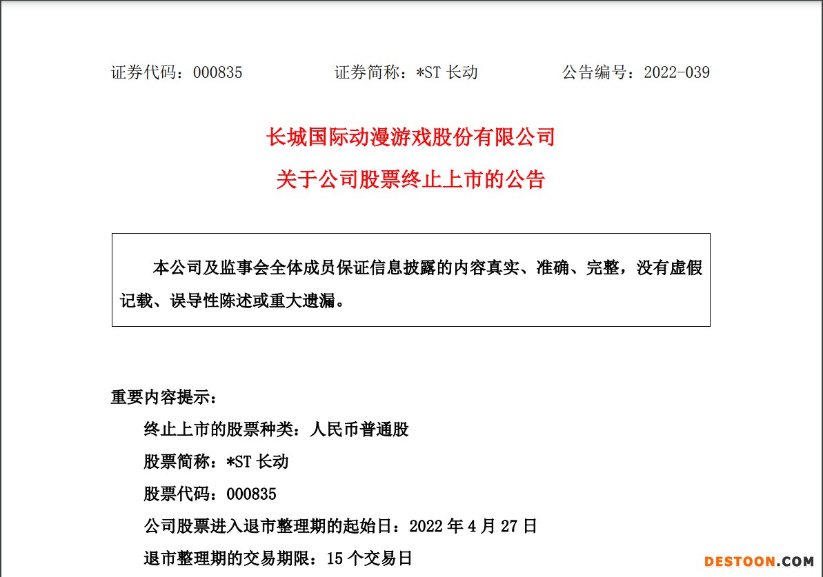 4月19日晚,*ST长动公告,当日其收到深交所《关于长城国际动漫游戏股份有限公司股票终止上市的决定》,深交所决定*ST长动股票终止上市,*ST长动股票自2022年4月27日起进入退市整理期。