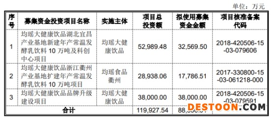 均瑶健康发行新股募集资金总额为9.40亿元,扣除发行费用后,募集资金净额为8.84亿元。均瑶健康于2020年8月5日披露的招股说明书显示,公司拟募集资金8.84亿元,分别用于均瑶大健康饮品湖北宜昌产业基地新建年产常温发酵乳饮料10万吨及科创中心项目、均瑶大健康饮品浙江衢州产业基地扩建年产常温发酵乳饮料10万吨项目、均瑶大健康饮品品牌升级建设项目。
