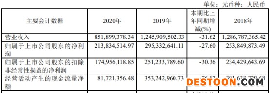 上市当年,均瑶健康业绩下滑。2020年,公司实现营业收入8.52亿元,同比减少31.62%;实现归属于上市公司股东的净利润2.14亿元,同比减少27.60%;实现归属于上市公司股东的扣除非经常性损益的净利润1.75亿元,同比减少30.36%;经营活动产生的现金流量净额为8172.14万元,同比减少76.87%。