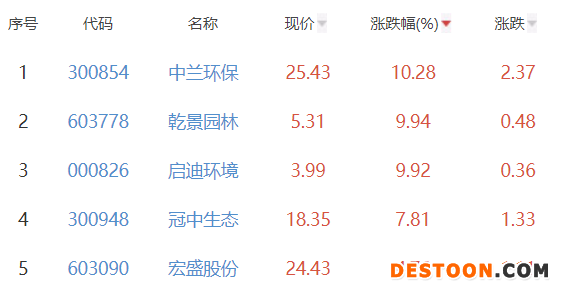 其中,中兰环保、乾景园林、启迪环境、冠中生态、宏盛股份位列板块涨幅前五位,涨幅分别为10.28%、9.94%、9.92%、7.81%、4.76%。