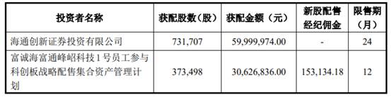 海通创新证券投资有限公司最终获配数量为731,707股,富诚海富通峰岹科技1号员工参与科创板战略配售集合资产管理计划最终获配数量为373,498股。