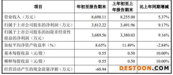 公司2022年第一季度(未经审计)营业收入为8698.11万元,较上年同期增长5.37%;归属于上市公司股东净利润为3812.22万元,较上年同期增长9.17%;扣除非经常性损益后的归属于上市公司股东净利润为3689.56万元,较上年同期增长9.16%;经营活动产生的现金流量净额为-60.94万元,上年同期为2867.76万元。