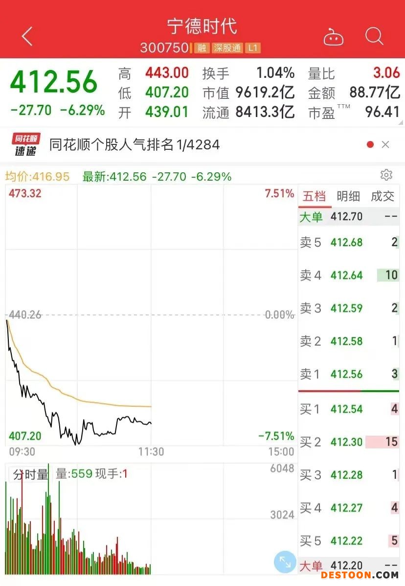 宁德时代盘中跌超7%,创去年6月以来新低。截至午间收盘下跌6.29%报412.56元/股,总市值跌破万亿。