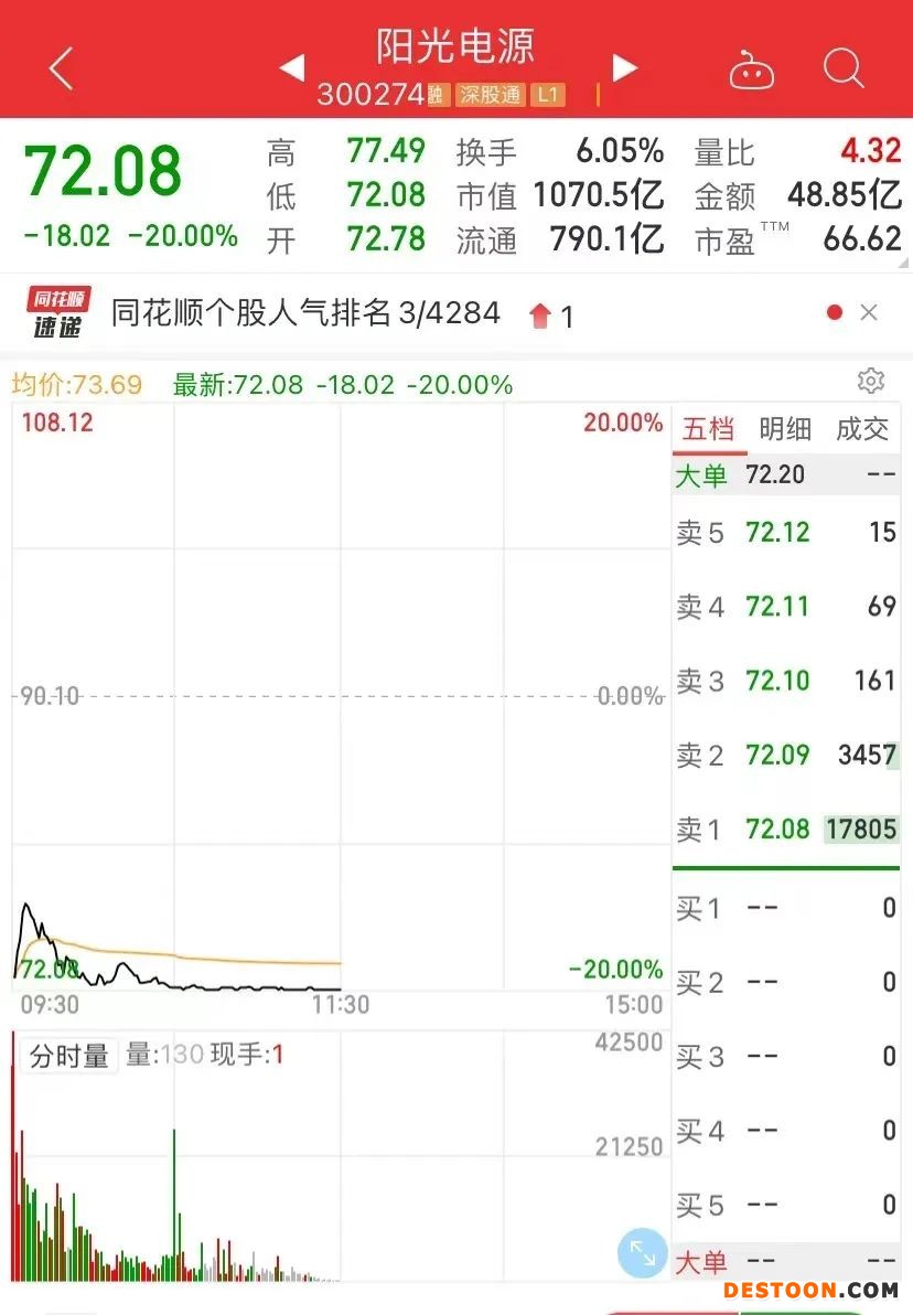 “光伏巨头”阳光电源也大幅低开,截至发稿前20%跌停,报72.09元/股,总市值1071亿元。消息面上,阳光电源昨日披露年报,净利润同比下跌19%。